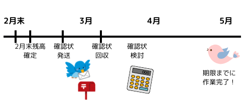 2月末を基準日として残高確認手続を行えば、これに関する作業は前倒しで実施できるから、期末日以降に実証手続の作業が集中することも防げるよ。