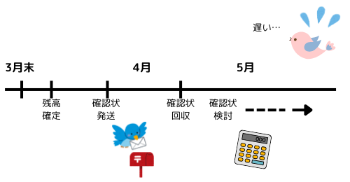 決算日が3月末の場合に、決算が締まるのを待って、3月末を基準日として確認状を発送し、それを回収してじっくり検討していると…?