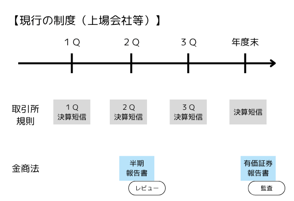 第2四半期についてはそれまでの四半期報告書に相当する半期報告書を引き続き提出するんだ。この半期報告書に含まれる中間財務諸表については、引き続きレビューを受けるよ。